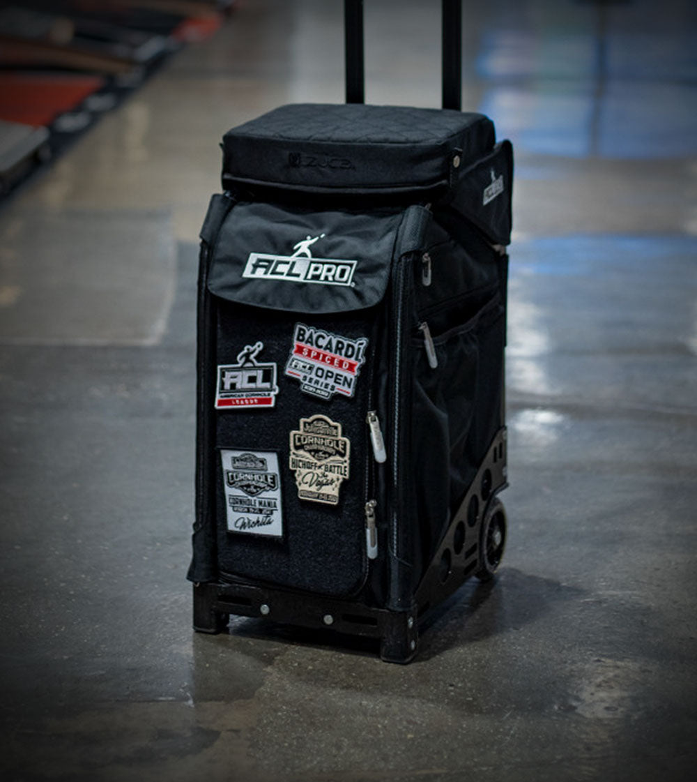 The ZÜCA Cornhole Pro is all you need. Full Velcro door panel displays all your patches. Features wheels on both sides on the outside of the frame which makes this rolling bag easy to pull up stairs.